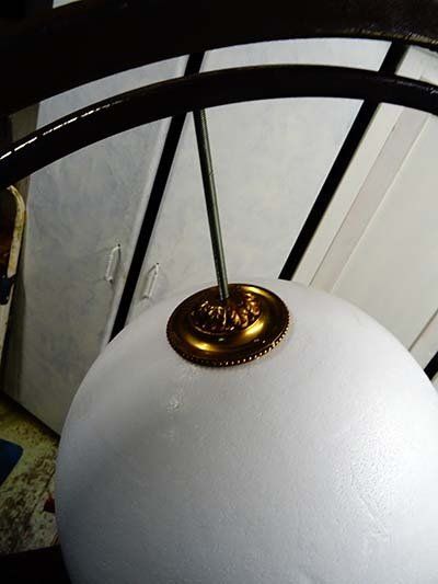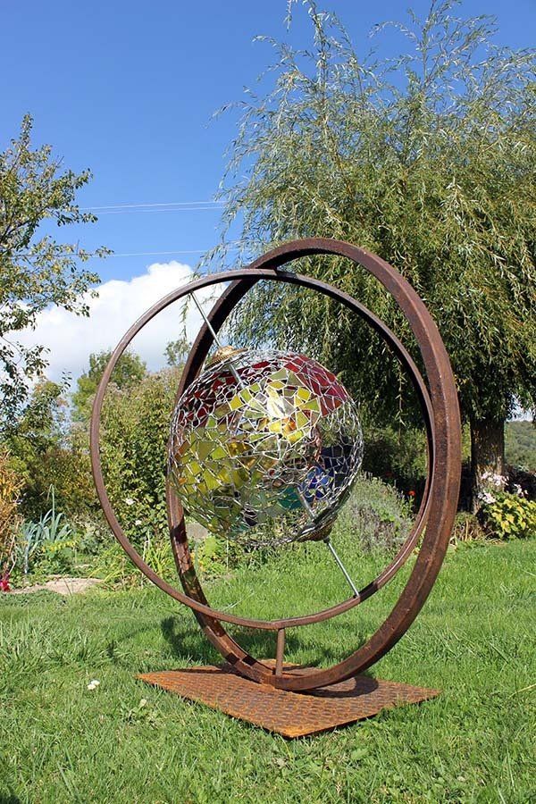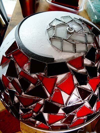 La sphère intérieure (diamètre 20 cm) est composée de pièces de miroir assemblées en technique Tiffany ajourée.