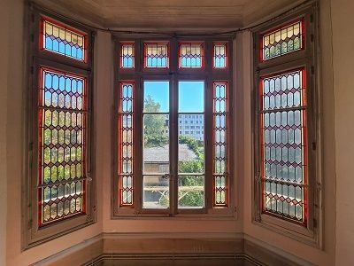Un ensemble de vitraux géométriques orne depuis longtemps ce magnifique bow-window : 6 panneaux en partie haute, 12 en partie basse, répartis 3 par 3.