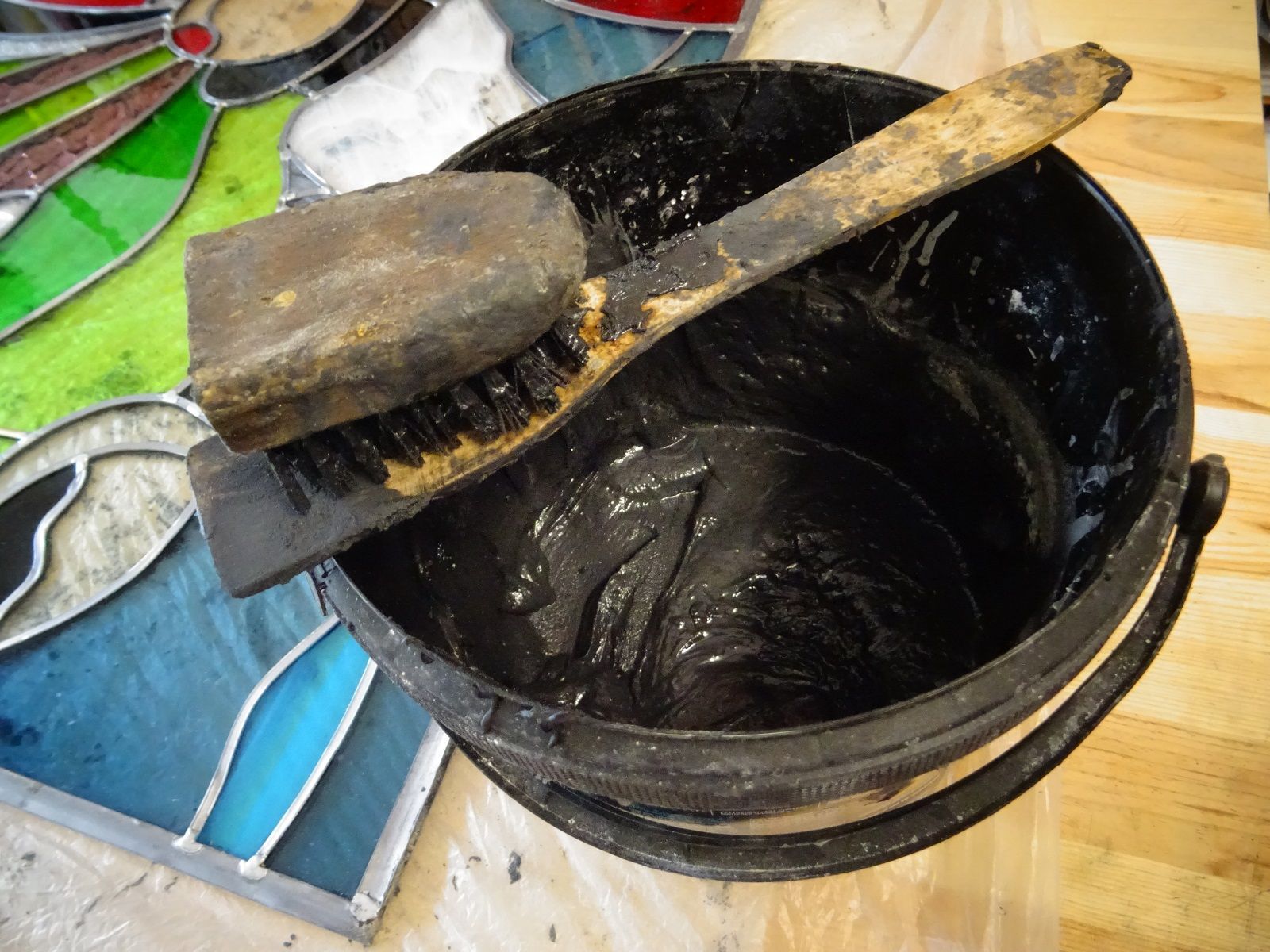 Réalisée en technique Tiffany, j'ai utilisé des verres soufflés et du verre verre imprimé. "La truite vive" a bénéficié de détails réalisés à la grisaille, peinture pour verre cuite au four à environ 600°C. D'un côté, l'ensemble dessine un arc de cercle renforçant la courbure du saut de la truite. L'autre coté a été laissé échancré pour ne pas "emprisonner" ce joli poisson.