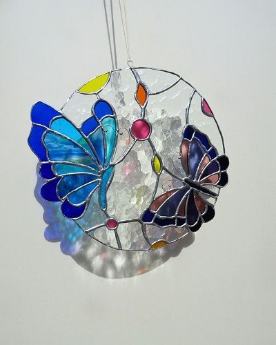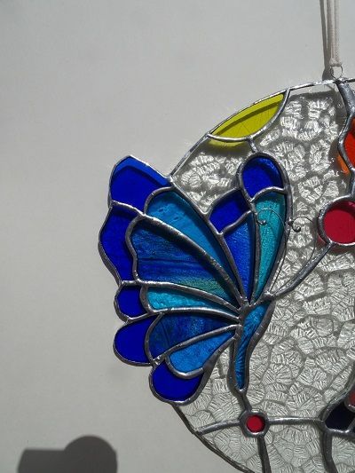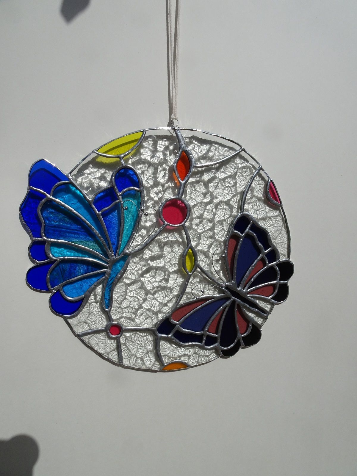 Chaque projet sur-mesure est une aventure unique. J'adore travailler avec vous pour transformer vos idées en magnifiques œuvres d'art en verre. Dans cette suspension, les ailes des papillons dépassent du cercle, symbolisant la liberté et l'évasion, ajoutant une touche poétique et aérienne à l’ensemble.