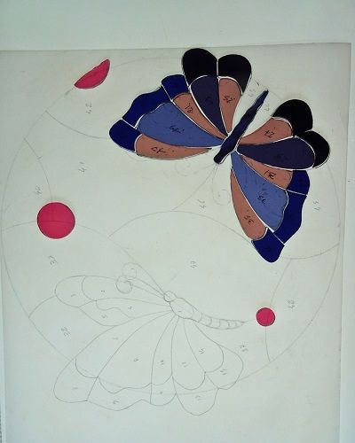 Ravie de vous présenter une de mes dernières créations, commandée comme cadeau sur-mesure : deux papillons en vol, colorés et légers, s’échappant délicatement du cercle qui les encadre.