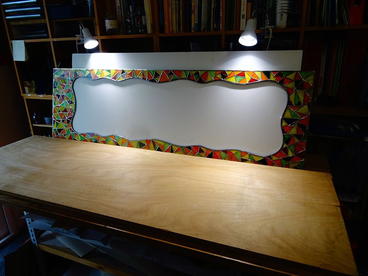 Nous y voilà, la partie vitrail est prête et peut être assemblée à la partie miroir. Pour respecter le parti pris esthétique, calage gauche, droit, haut, bas en ménageant une largeur constante de miroir autour du vitrail. Ainsi les reflets de la partie centrale s’interrompent à l’endroit du vitrail et reprennent sur la périphérie.