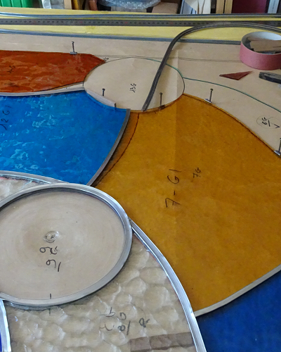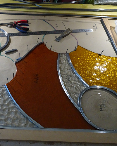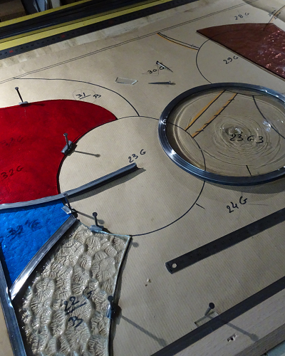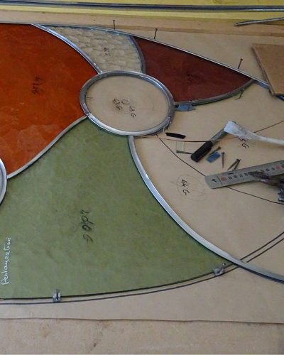 Découvrez en images le montage de ces panneaux, où chaque pièce de verre et chaque baguette de plomb trouvent leur place pour créer un ensemble harmonieux et durable.