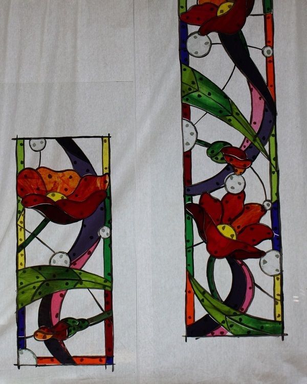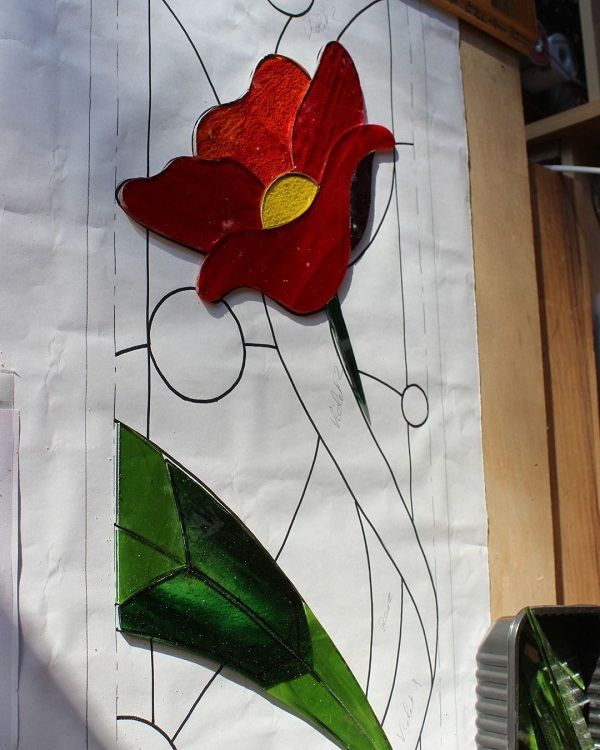 Pour ce projet haut en couleur, chaque pièce de verre est minutieusement coupée et temporairement disposée sur une plaque de verre. Cette technique me permet de voir comment les couleurs interagissent en contrejour, assurant ainsi une harmonie parfaite entre les teintes.