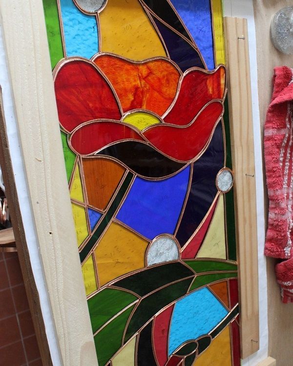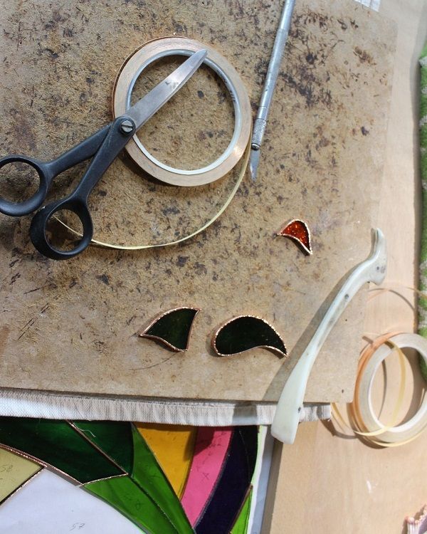 Avec toutes les pièces de verre coupées et ajustées, l'étape suivante pour réaliser le vitrail est celle du sertissage. C'est ici que chaque pièce de verre trouve sa place définitive, ici sertie dans un ruban de cuivre adhésif destiné à recevoir la brasure à l’étain solidarisant les pièces de verre entre-elles.