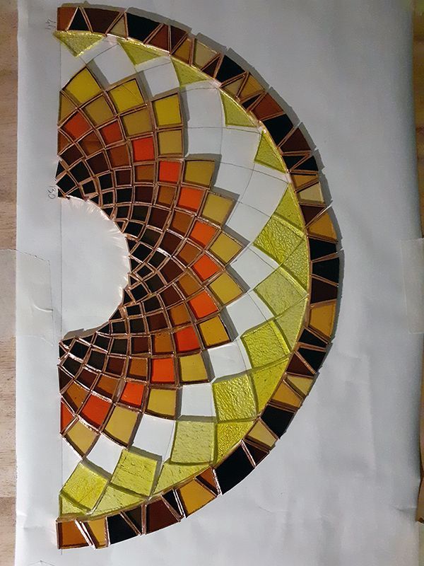 Pour les sous-ensembles Tiffany, chaque pièce de verre est entourée de cuivre adhésif. Ensuite, on réalise un cordon de brasure à l’étain sur le cuivre de 2 pièces contiguës.