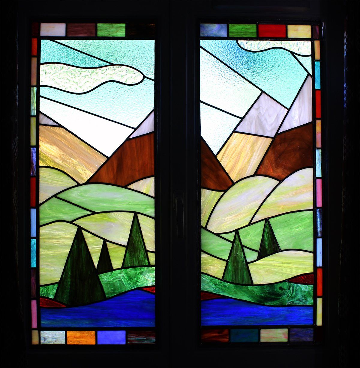 J’ai redimensionné les vitraux en créant une bordure multicolore qui rappelle les couleurs de la composition centrale et qui apporte une vivacité complémentaire à l’ensemble.