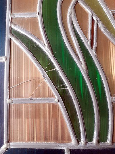 Ce vitrail traditionnel présentait un état de détérioration notable, marqué par plusieurs pièces de verre cassées, certaines d'entre elles portant même des fragments plus petits, témoins d'une tentative de réparation malheureusement infructueuse.