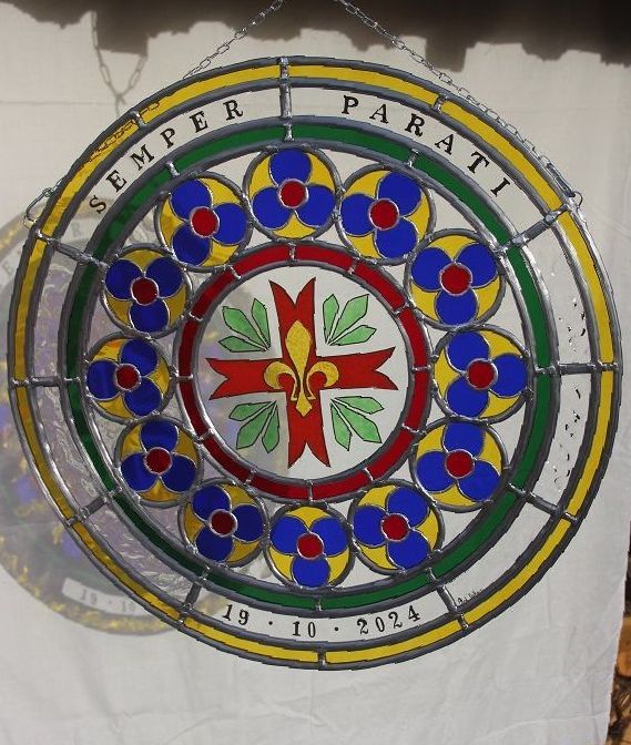 Voici enfin le vitrail Semper Parati dans toute sa splendeur ! Sous la lumière, les couleurs prennent vie, et les verres choisis diffusent un jeu de reflets uniques. Du bleu profond aux touches de jaune éclatant, chaque teinte raconte une histoire en résonance avec les valeurs qu’il représente.