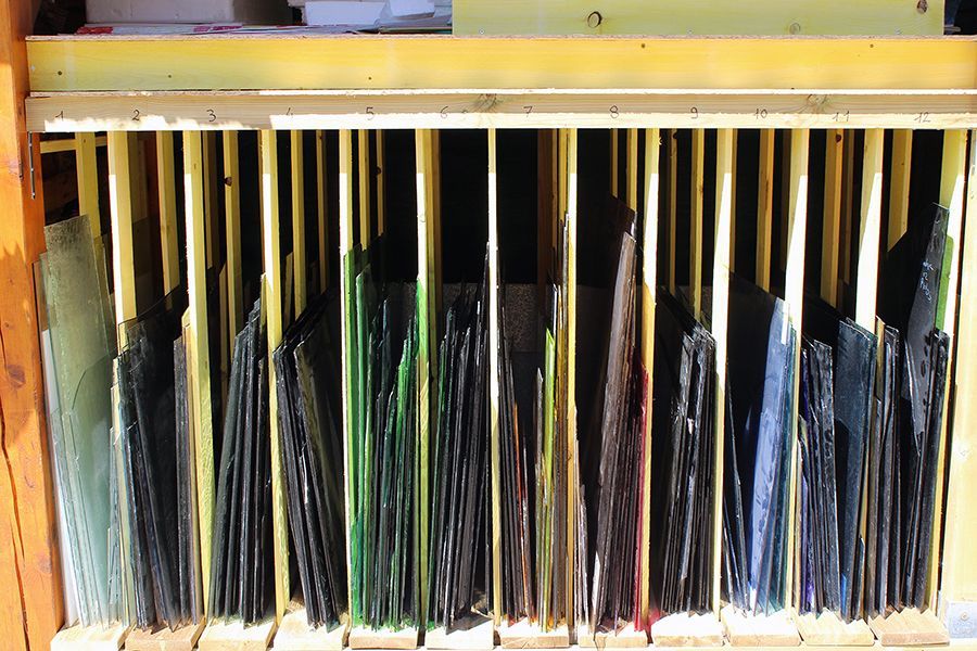Après la maquette, l'échelle 1, le choix des verres, la coupe des pièces de verres, le sertissage cuivre, le montage Tiffany et traditionnel, la brasure à l'étain, vient le temps du masticage de la partie traditionnelle.