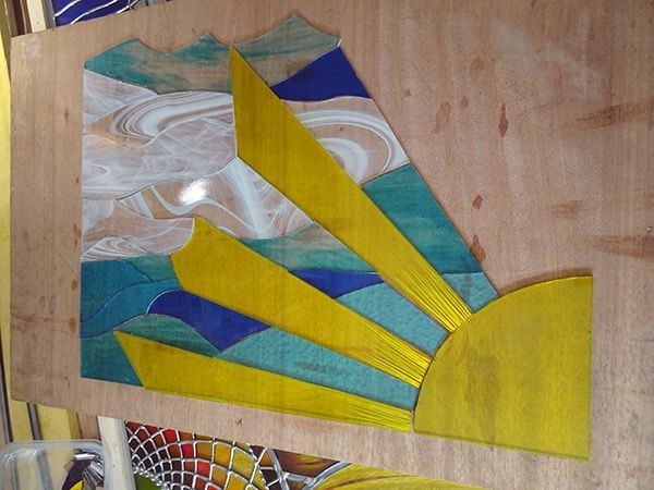 En technique traditionnelle, ou en technique Tiffany, on coupe généralement toutes les pièces de verre avant d’envisager le sertissage des pièces entre elles.