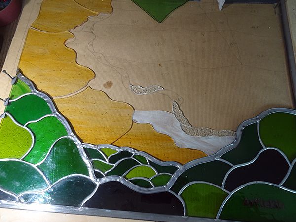 Pour la technique de mise en œuvre, après discussion avec Alain (le commanditaire) avec nous avons opté pour la technique combinée, combinaison des techniques traditionnelle et Tiffany. Cette combinaison permet que les zones composées de petites pièces de verre restent visuellement aérées (cœur du tournesol), et de varier les largeurs de lignes entre pièces de verre pour renforcer certains contrastes entre les plans du paysage. Bien entendu, le choix de la technique a été intégré dès le tracé.