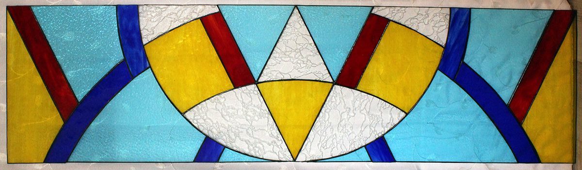 Une fois toutes les pièces de verre coupées et meulées, sertissage avec le cuivre adhésif, montage, brasure à l’étain, nettoyage et, pour ce vitrail, patine noire appliquée sur les cordons de brasures. Je profite de quelques reflets d’atelier puis, c’est la pose.