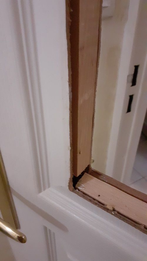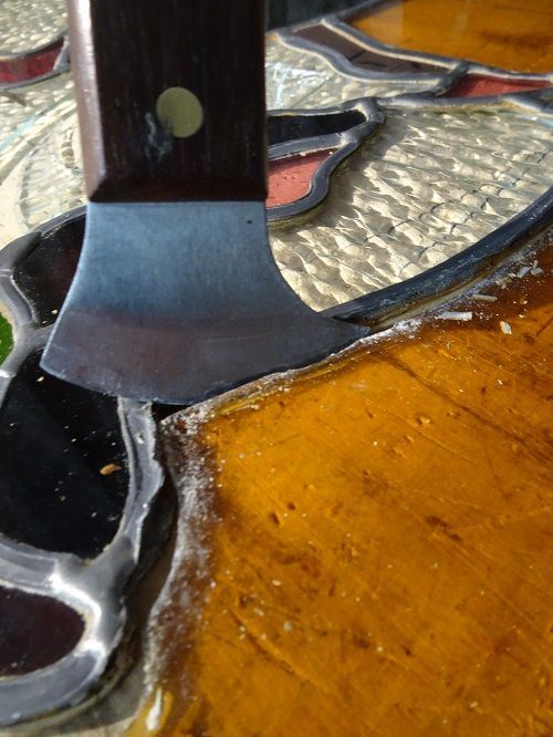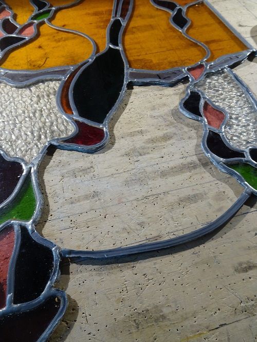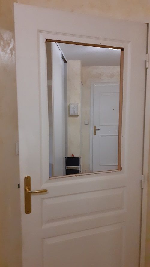 Le vitrail quitte sa porte pour passer par l’atelier. Pour le transport, j’ai scotché les pièces cassées afin qu’aucun fragment ne se perde.